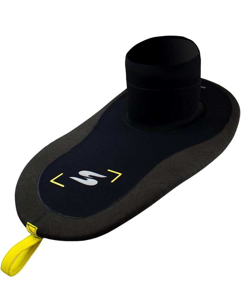 Se aplica una capa de caucho Sika alrededor del borde interior de la falda. Esto aumenta la fuerza general de la cubierta y asegura un excelente agarre al labio del kayak. El tubo está hecho de neopreno de 3 mm, mientras que la parte del borde superior es neopreno reforzado ‘’Mesh’’. Esta solución garantiza un agarre impecable en su torso, evitando que el tubo se deslice de su cintura, asegurando un perfecto sellado contra el agua.